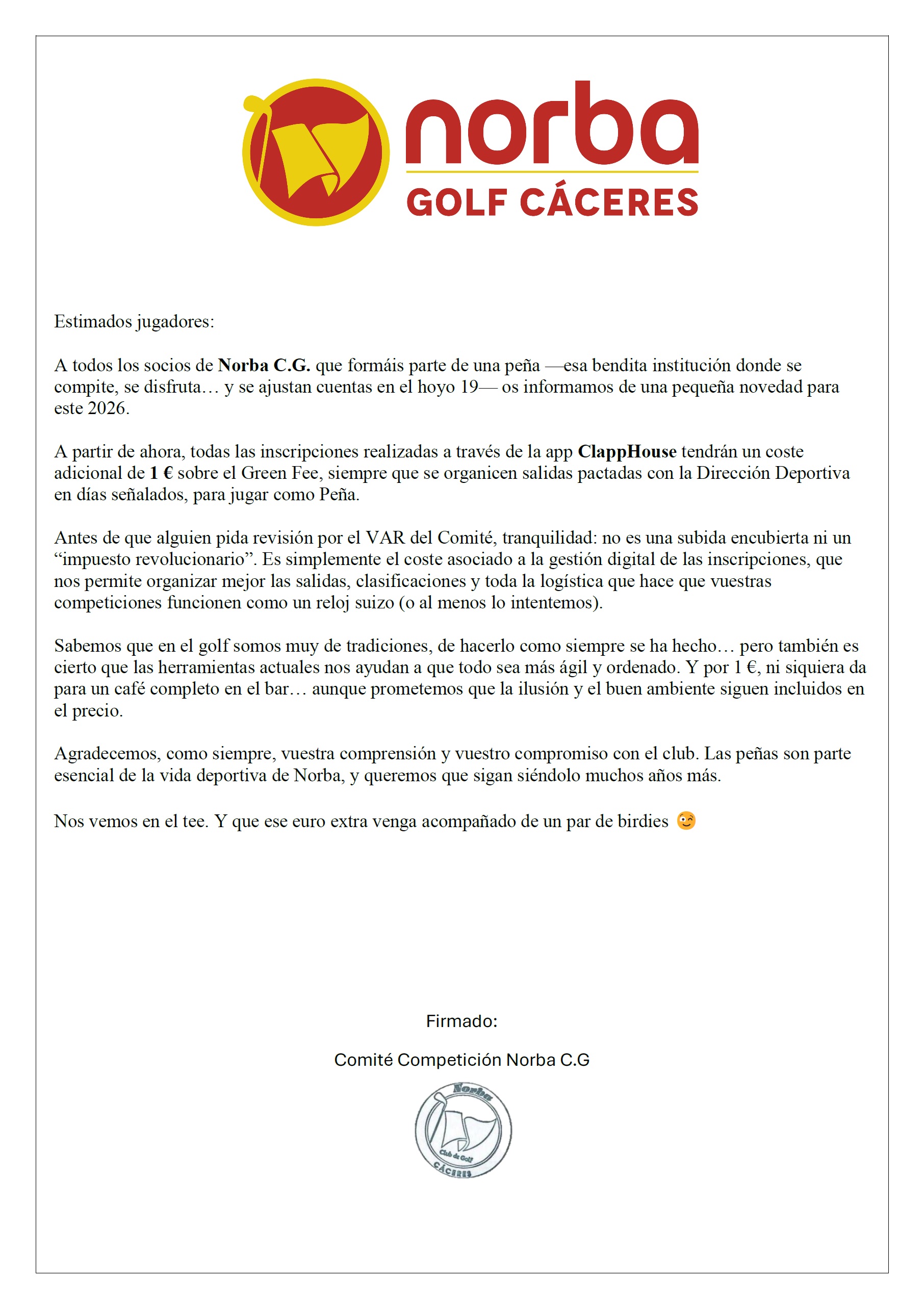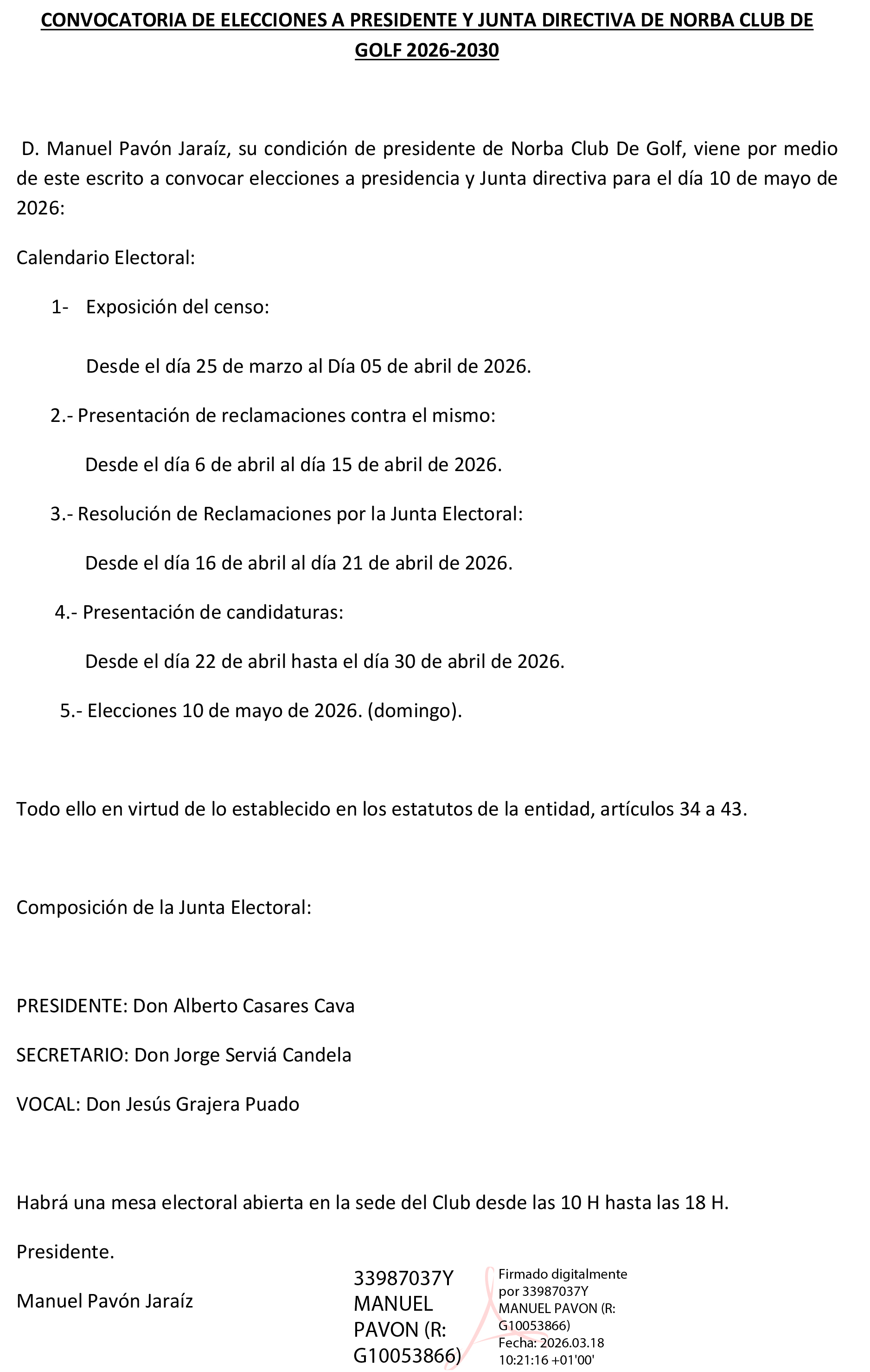 CONVOCATORIA DE ELECCIONES A PRESIDENTE Y JUNTA DIRECTIVA DE NORBA CLUB DE GOLF 2026-2030